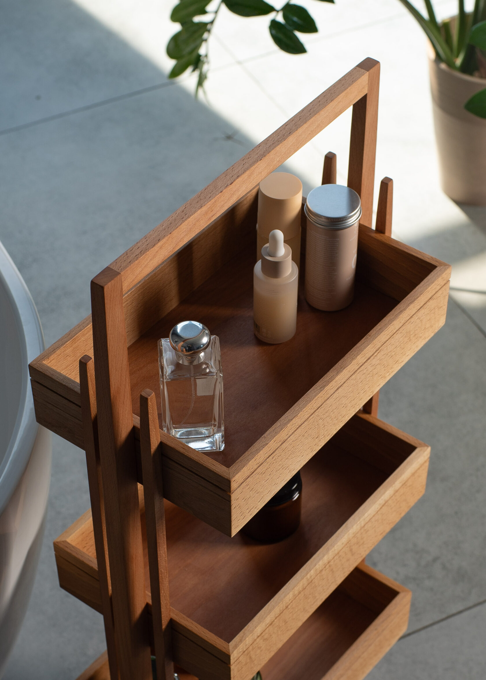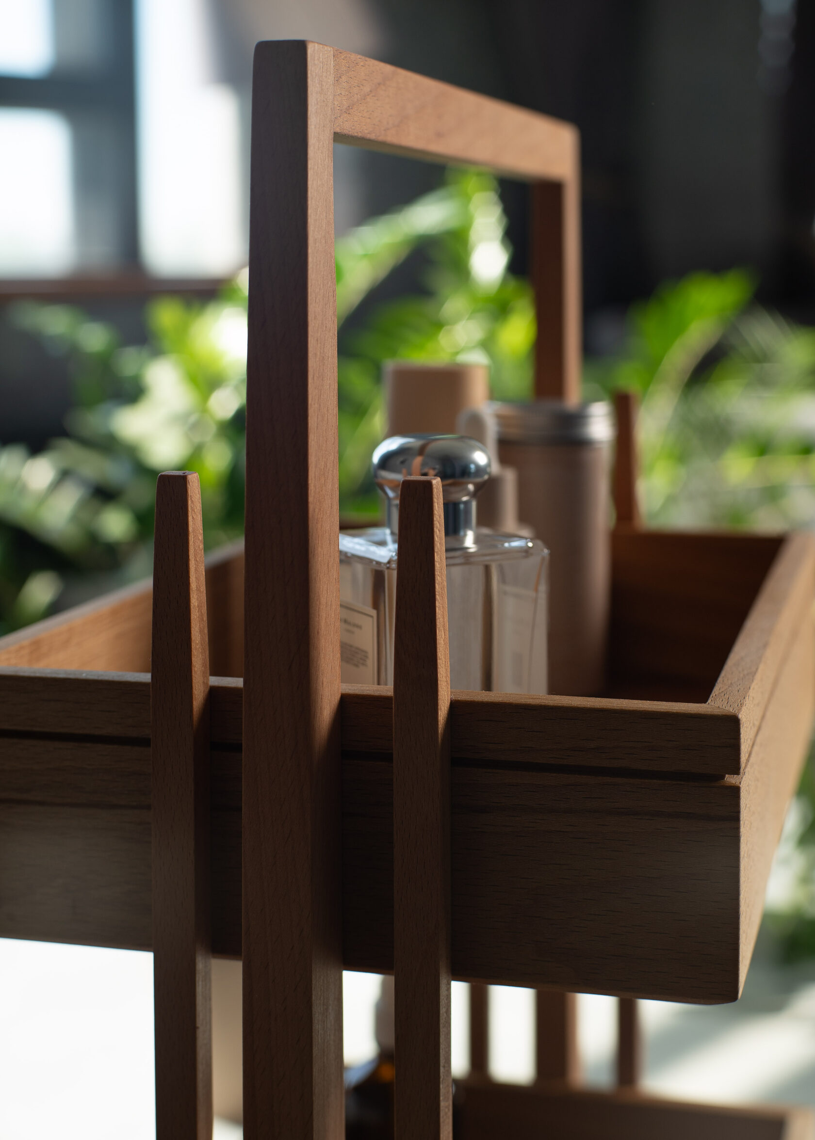 Устремленность вверх, заостряющиеся вертикальные элементы в перекличке с ритмичной теневой горизонтальной полосой - архитектурные элементы стиля ар-деко, которые стали вдохновляющим началом для создания дизайна этажерки.